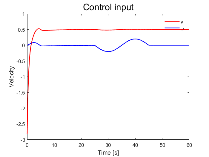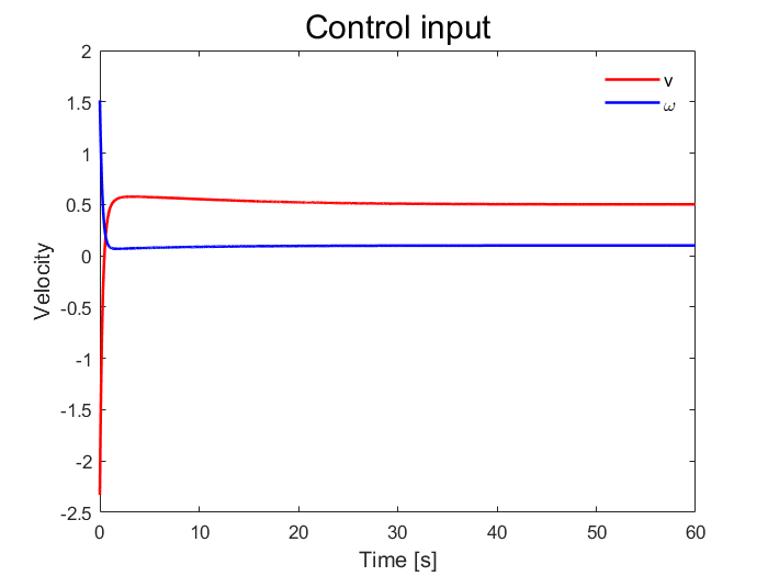 식에서 볼 수 있듯이 제어 입력은 $v$, $\omega$, 각각 선속도, 각속도이다.