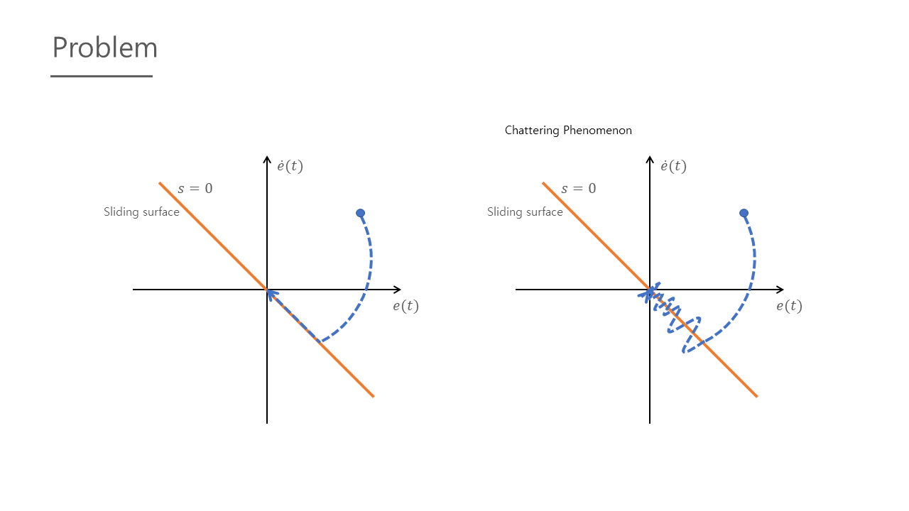 위와 같은 간단한 model이 있다 하자. Sliding surface는 $s(t)$와 같이 정의된다. $n$은 system 차수로 1차의 경우 sliding surface가 존재하지 않아 2차에서 사용이 가능하다.